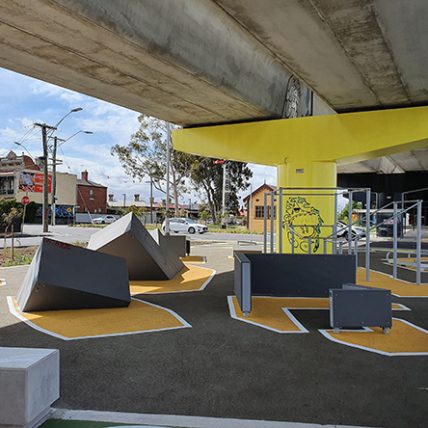 People walking or cycling between Moreland and Coburg stations will come across another outdoor tennis table sitting aside a small fitness node encompassing a back n abs workout and flying rings for sit-ups/pull-ups. Further along under the rail line is a large Sisu Fitness frame that offers challenges to both beginners and more advanced users, as the versatile equipment allows for variations of users’ exercise routines.