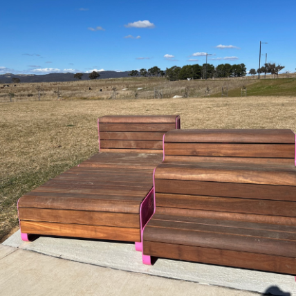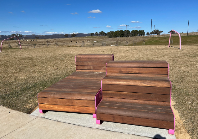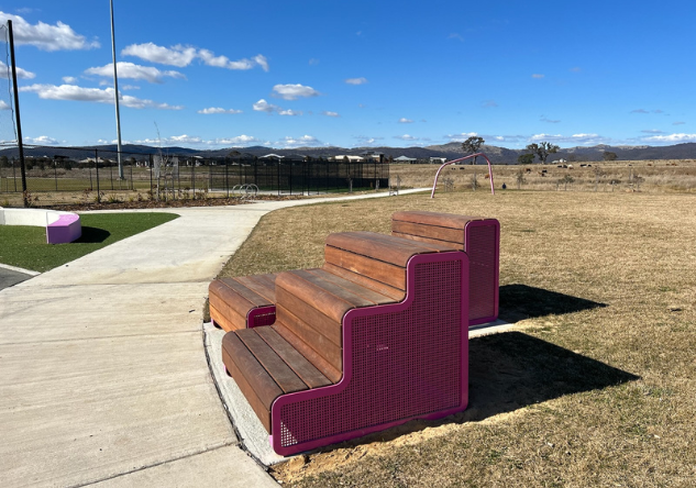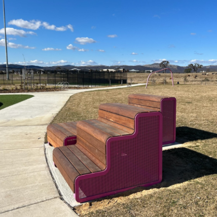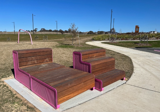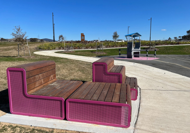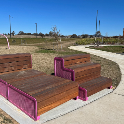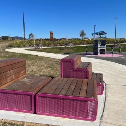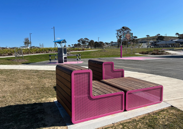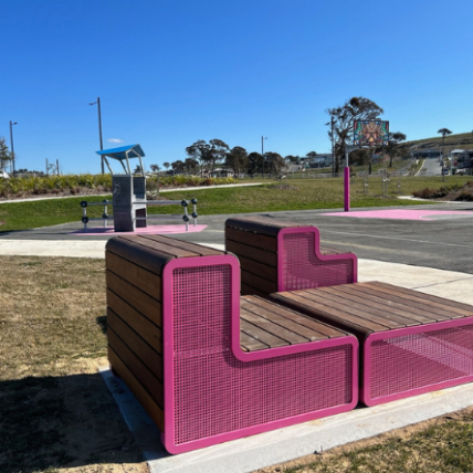 The vibrant pink Chilla outdoor furniture suite is an exciting and versatile addition aslo. Located adjacent to the Fono Interactive DJ Booth, the Chilla Chillout Zone features durable casual seating elements. These seating modules can be installed individually but are most effective when grouped together, providing ample and accessible hangout spaces. Designed for relaxation, the Chilla Chillout zone is ideal for this youth-focused area where teens can meet, gather, relax and share.