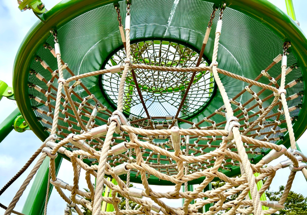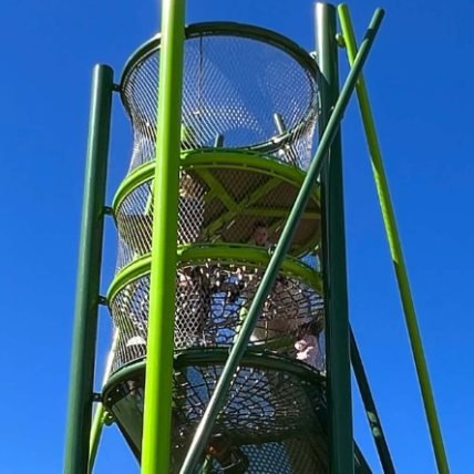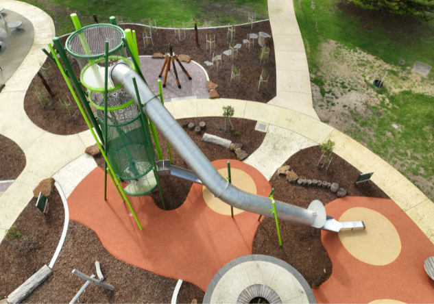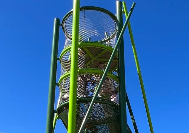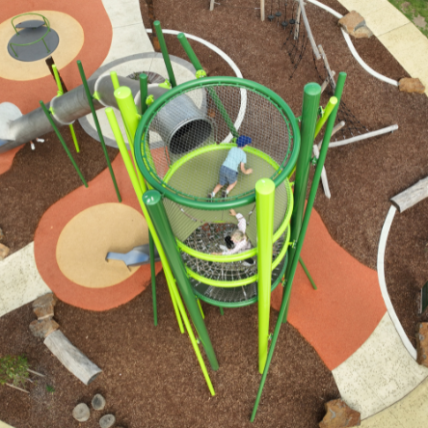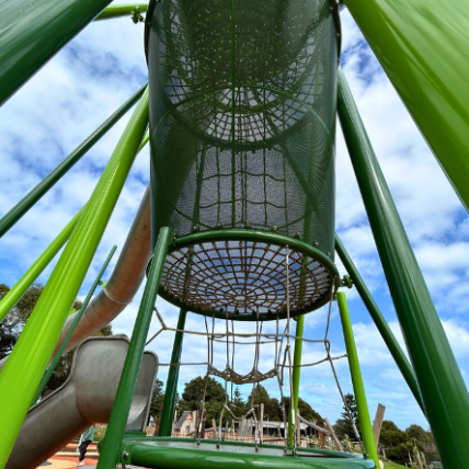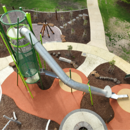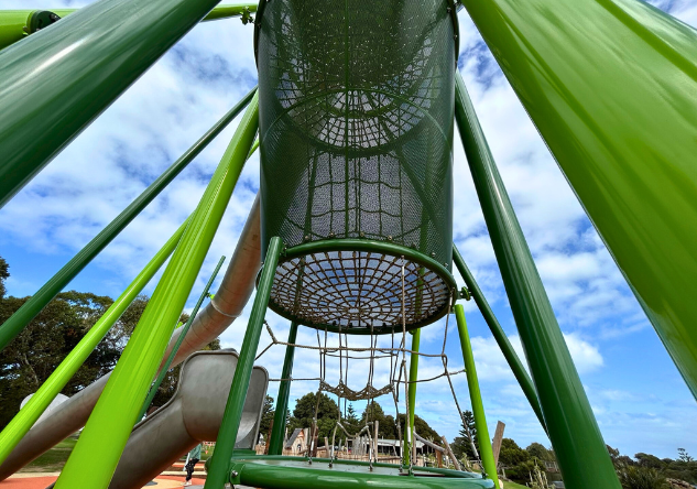 The centerpiece of the playspace is the custom-designed, 10-meter Grass Art Tower, a creation by our partner Spiel-Bau. This towering giant boasts a thrilling super high slide and diverse climbing challenges, beckoning young adventurers to explore. Built with resilience in mind, the tower and slide utilise C5 powder-coated and 316 Marine Grade Stainless steel, ensuring they withstand our Australian environment, including the nearby ocean spray.