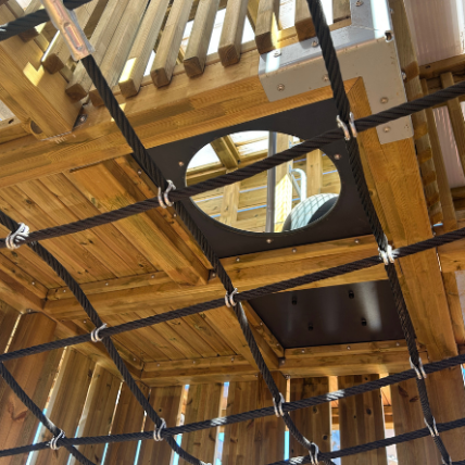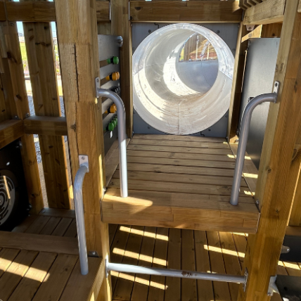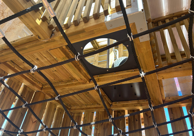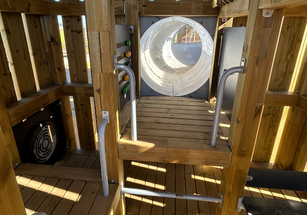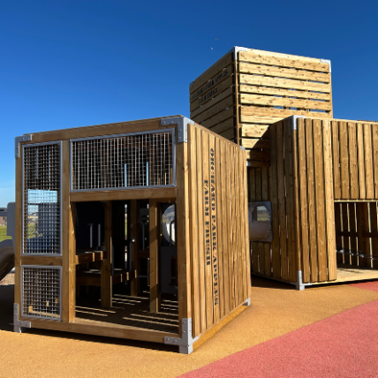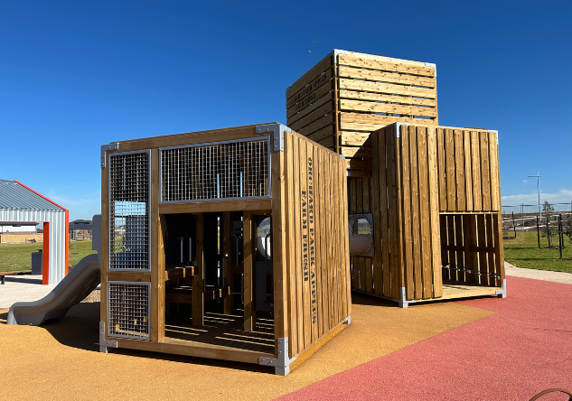 The design brief, issued in early 2022, called for a custom ‘apple crate’ tower. Using the Lappset Cubic range as the base structure allowed the eponymous design vision to be achieved with custom cladding and detailing, while avoiding the cost, delays, and compliance challenges of a fully bespoke build.