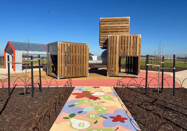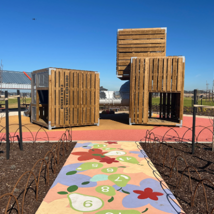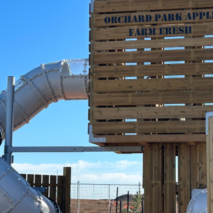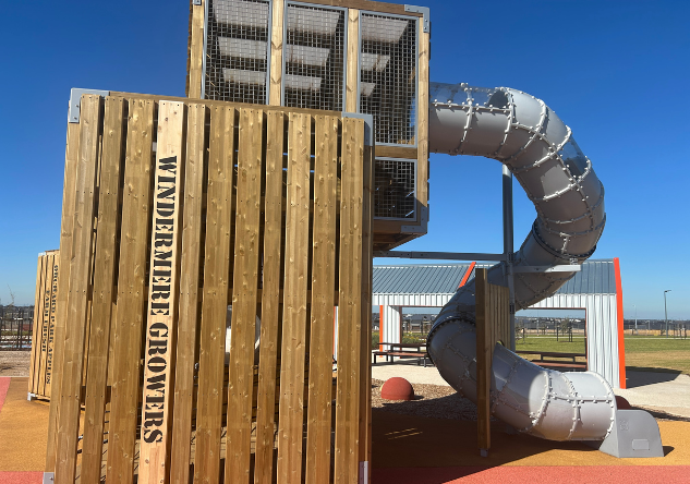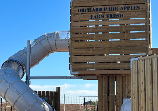 The tower pays tribute to the area’s heritage, referencing Orchard Park Apples, Farm Fresh, and Windermere Growers. This thematic detailing grounds the play structure in local history while maintaining durability, safety, and efficiency.