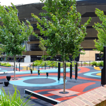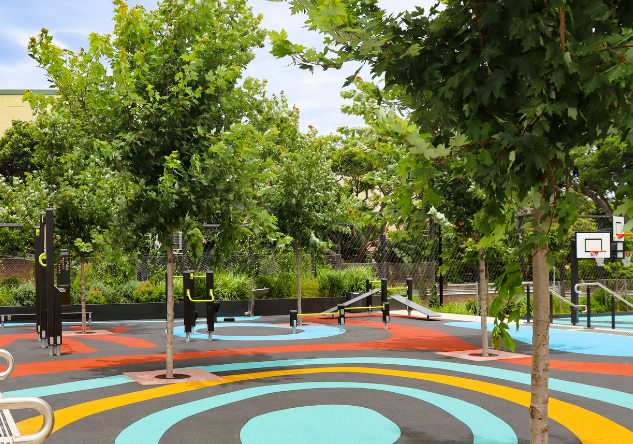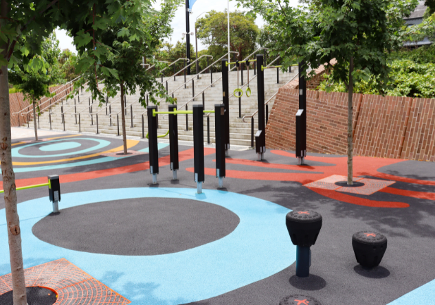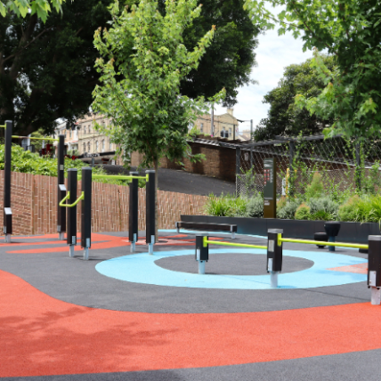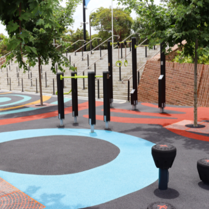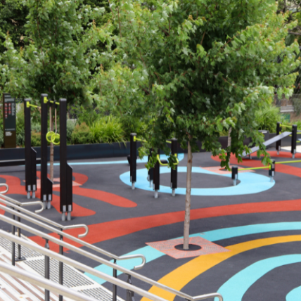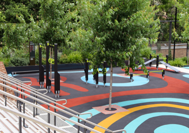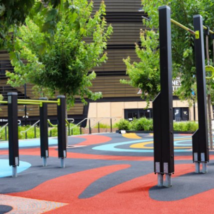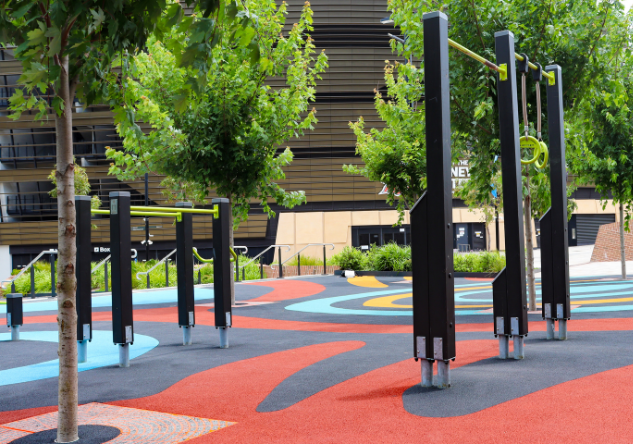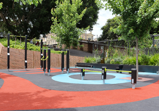 A dedicated outdoor fitness space, designed by Infrastructure NSW and Aspect Studios, is situated within the landscape of the newly developed Sydney Football Stadium.